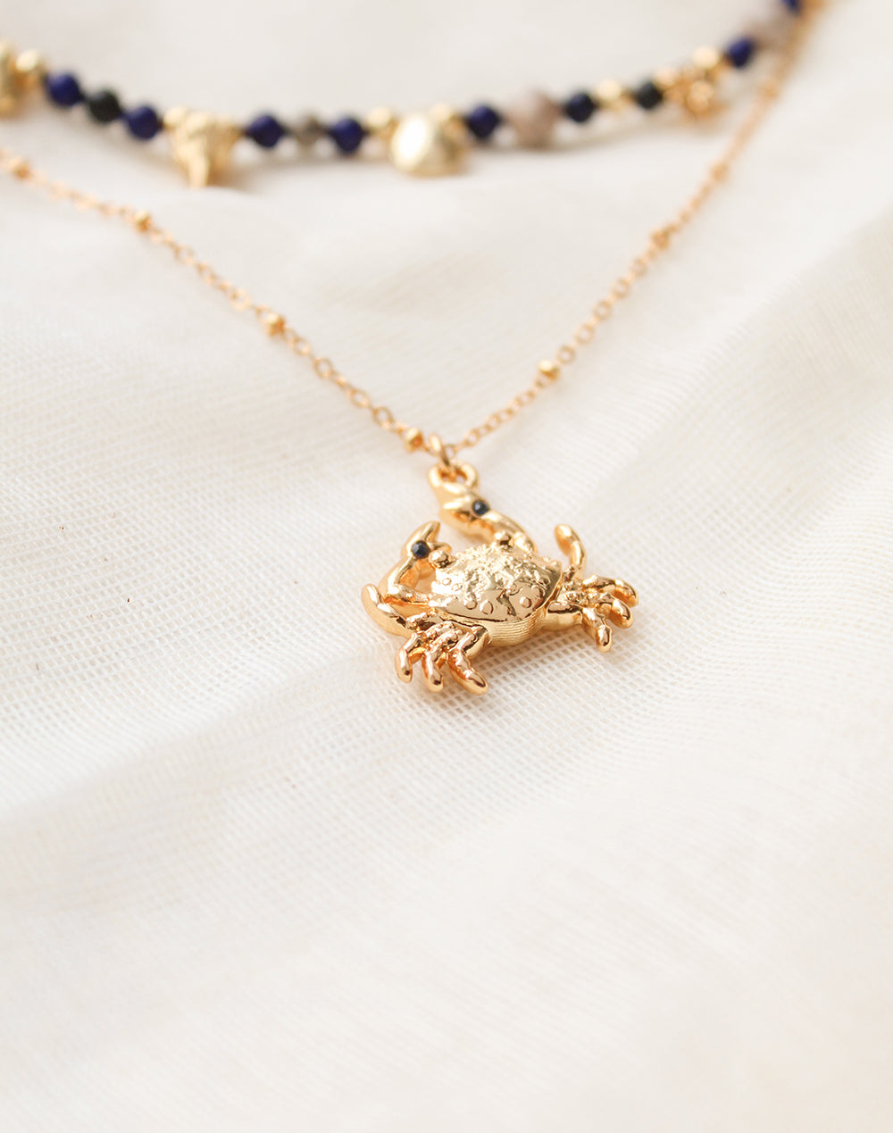 Este set romántico y atemporal, es ideal para agregar un pop de color a todos tus looks. Uno de lo collares tiene un mix de piedras naturales y dijes en dorado de: Semillas de mangle y moluscos. El otro collar tiene a nuestro protagonista, el Cangrejo Azul con una piedra en tono azul.