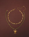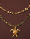 Un set inspirado en el movimiento constante del mar Pacífico y sus mareas. Este layering combina un choker de peces en oro italiano con incrustación de cristales cónicos en tonos verdes y azules, junto a un collar con cadena tejida en hilo encerado y cadena con baño en Oro 24k, acompañado de un dije de tortuga carey protagonista.
