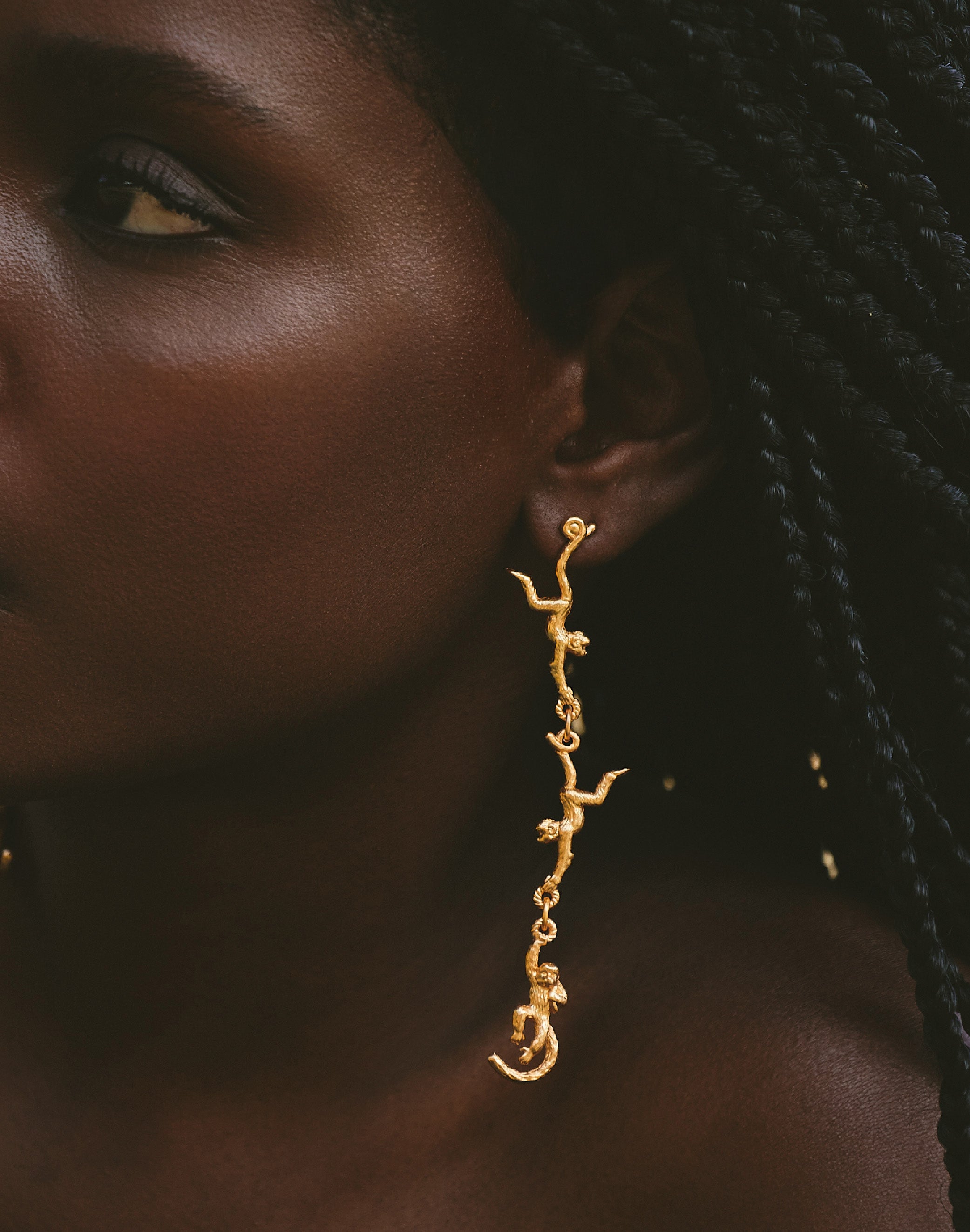 Estos pendientes representan al tití del Pacífico colombiano, una especie que habita los manglares y la selva húmeda de la región. Su diseño de tres monos colgantes crea movimiento y carácter, convirtiéndolos en una pieza llamativa y llena de simbolismo.