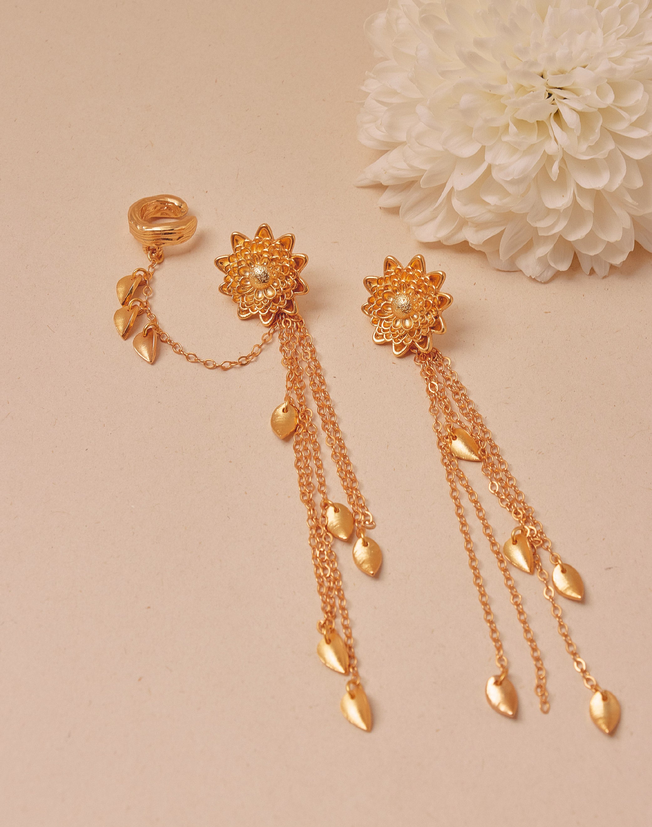 Una pieza compuesta por un earcuff en forma de raíces y un topo de crisantemo, unidos por delicadas cadenas que caen como raíces con hojas en movimiento. Combina detalle botánico...