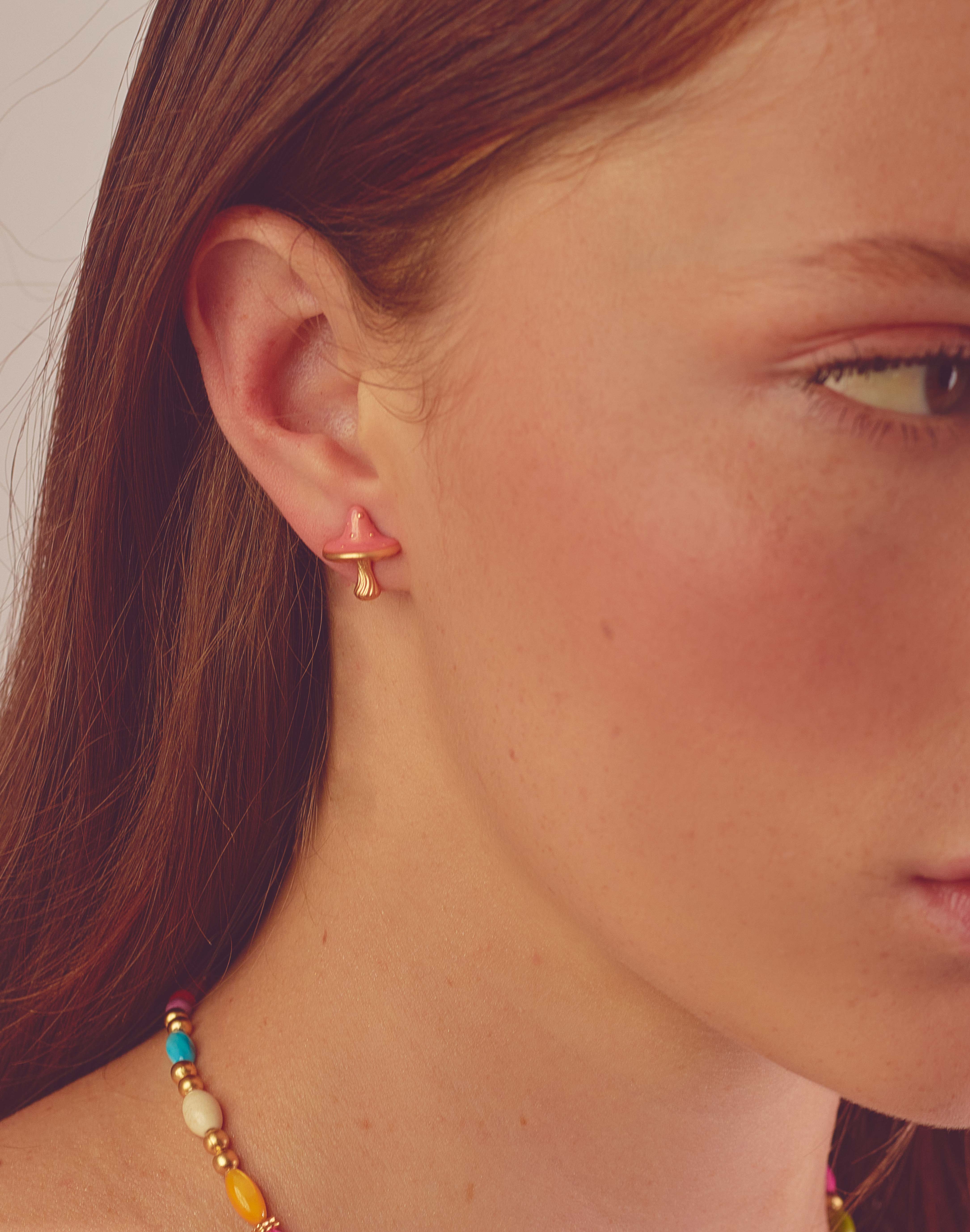 Aretes indispensable en todos los joyeros, mini hongos con decoración en resina rose traslúcida. Perfectos para quienes prefieren los looks divertidos. Especificaciones: Baño en Oro de 24k
