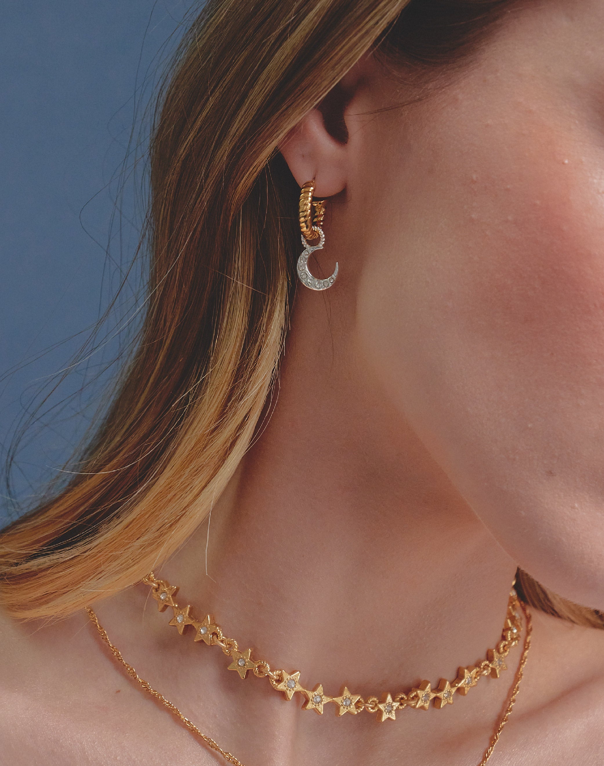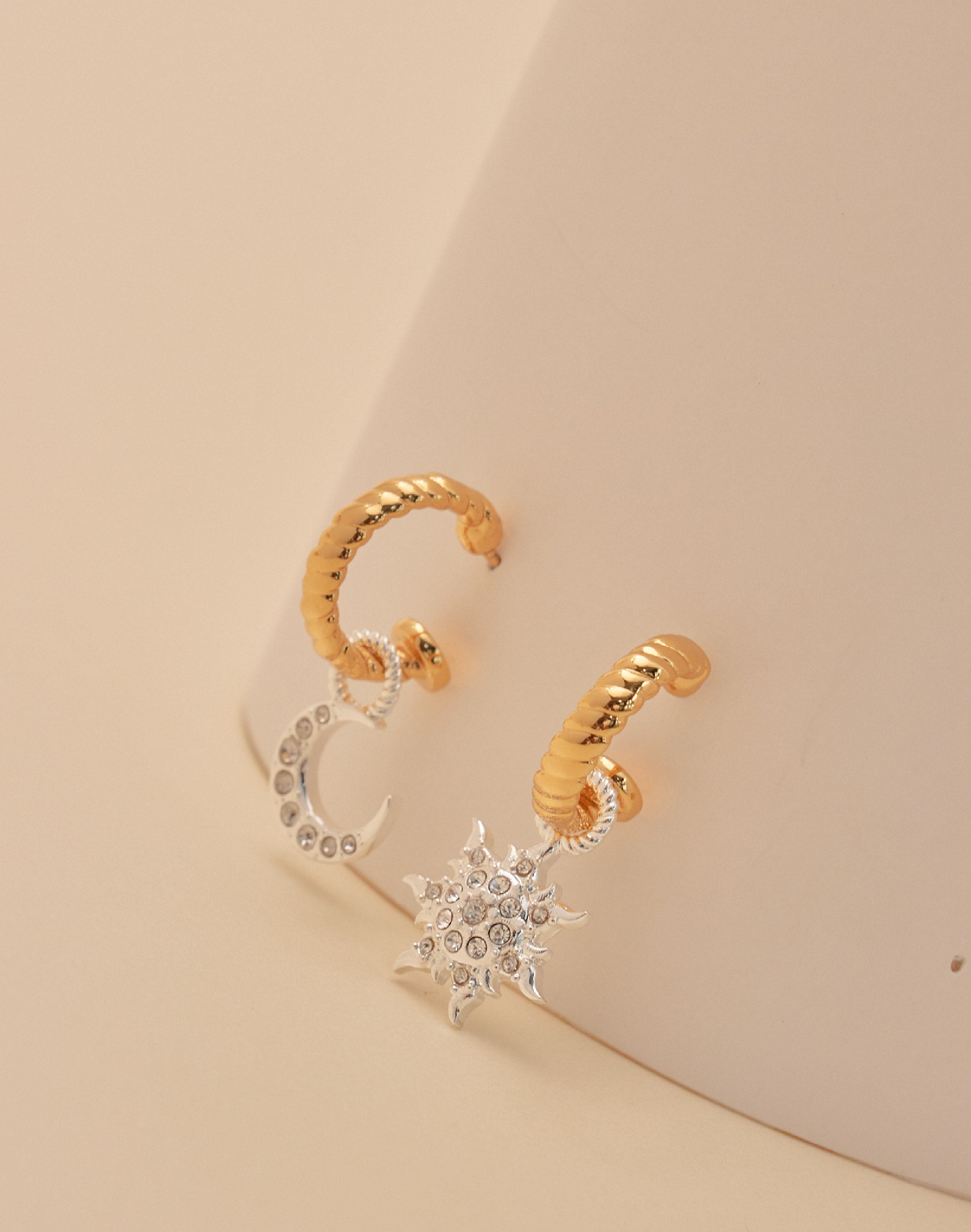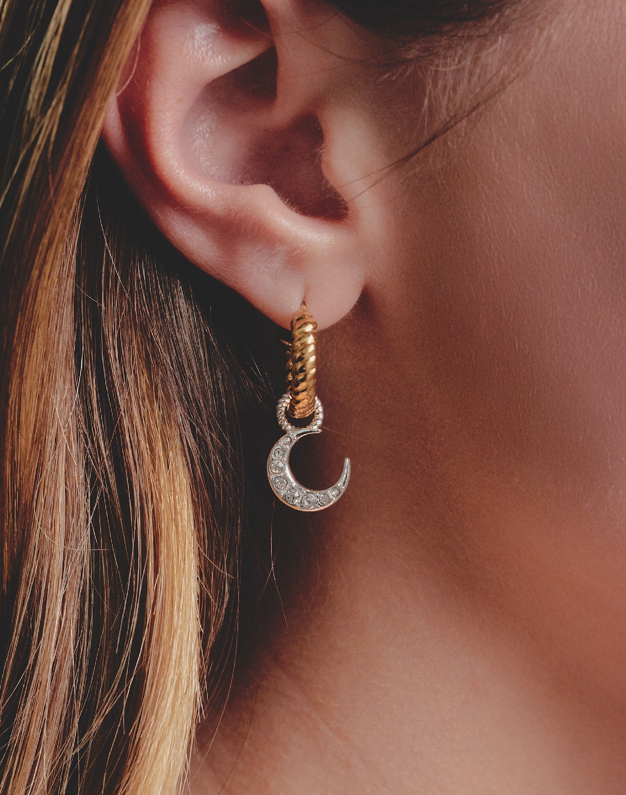 Estas candongas combinan el brillo del oro y la plata para un look único. Cada una lleva un dije removible: una estrella y una luna. Cambia los dijes cuando quieras...