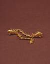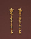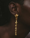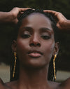 Pendientes largos inspirados en el movimiento de los cardúmenes del Pacífico colombiano. Su diseño en cascada presenta un pez principal de mayor tamaño seguido por peces que disminuyen progresivamente, creando fluidez y dinamismo. Los cristales en tonos dorado, verde y azules evocan los reflejos del mar en constante movimiento.