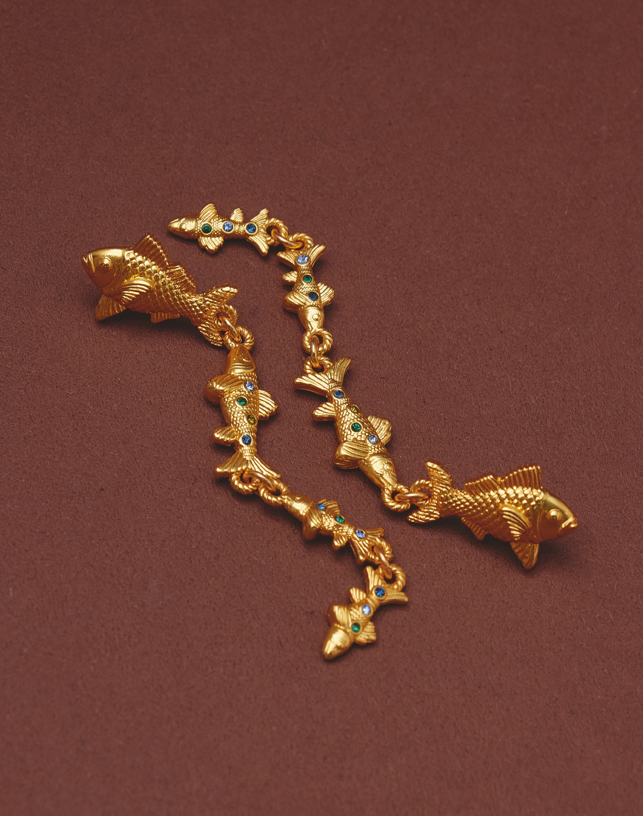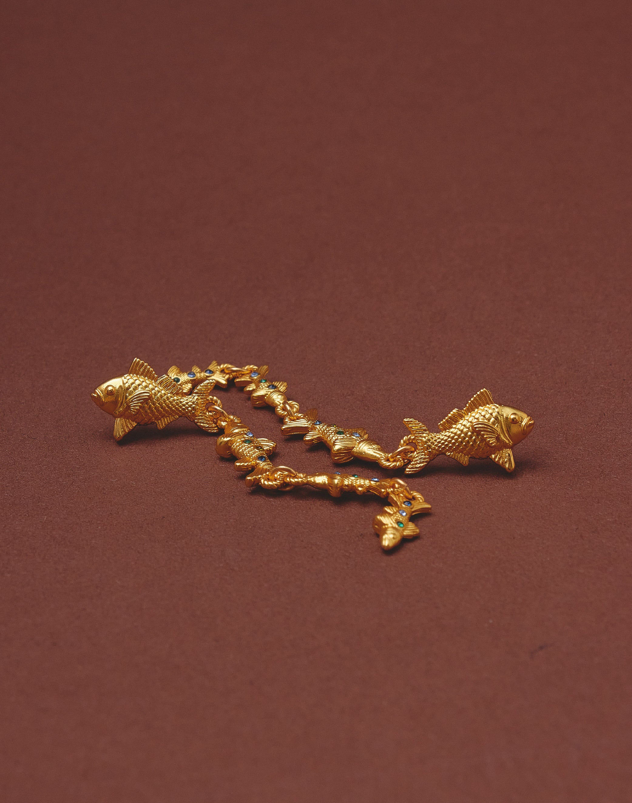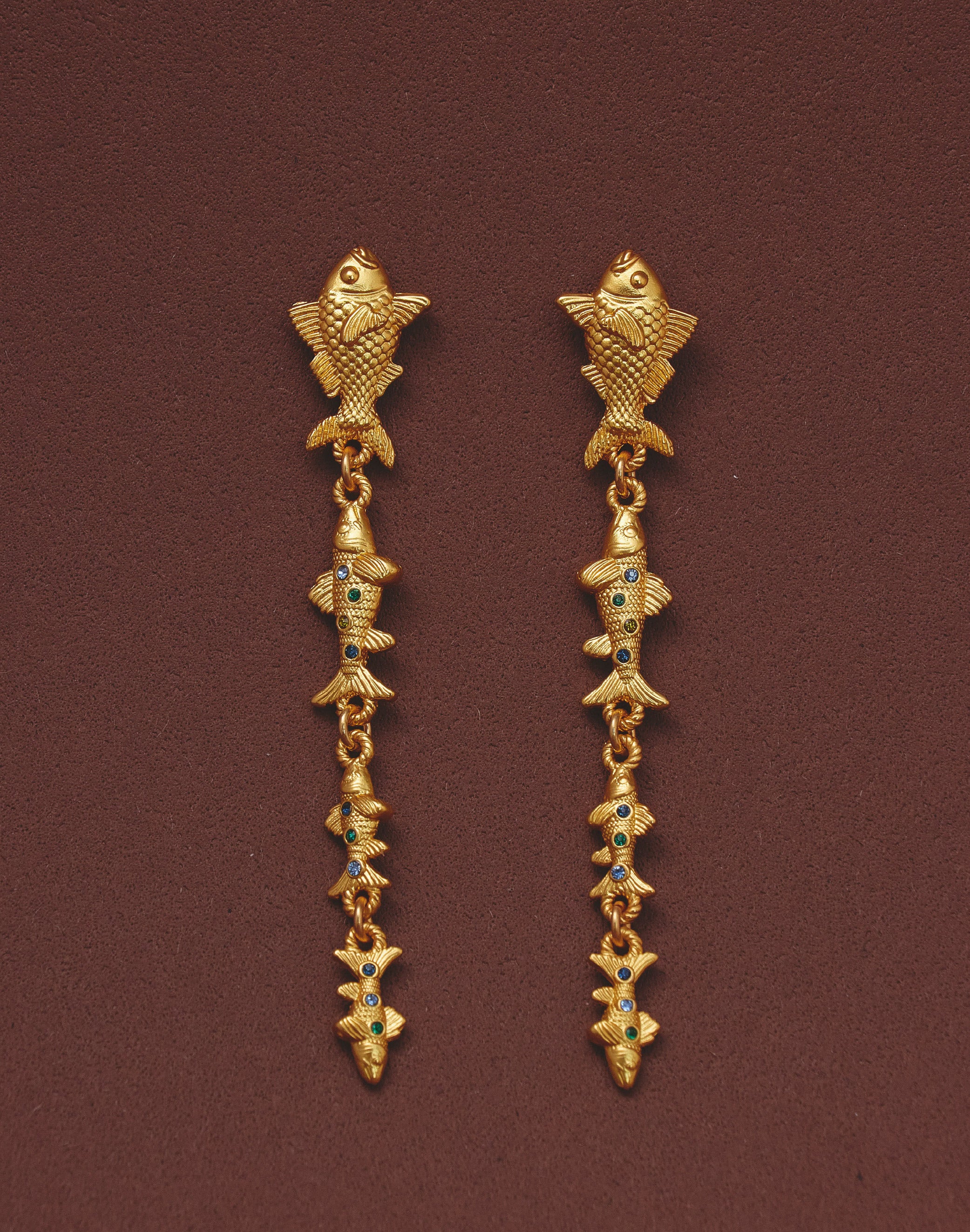 Pendientes largos inspirados en el movimiento de los cardúmenes del Pacífico colombiano. Su diseño en cascada presenta un pez principal de mayor tamaño seguido por peces que disminuyen progresivamente, creando...