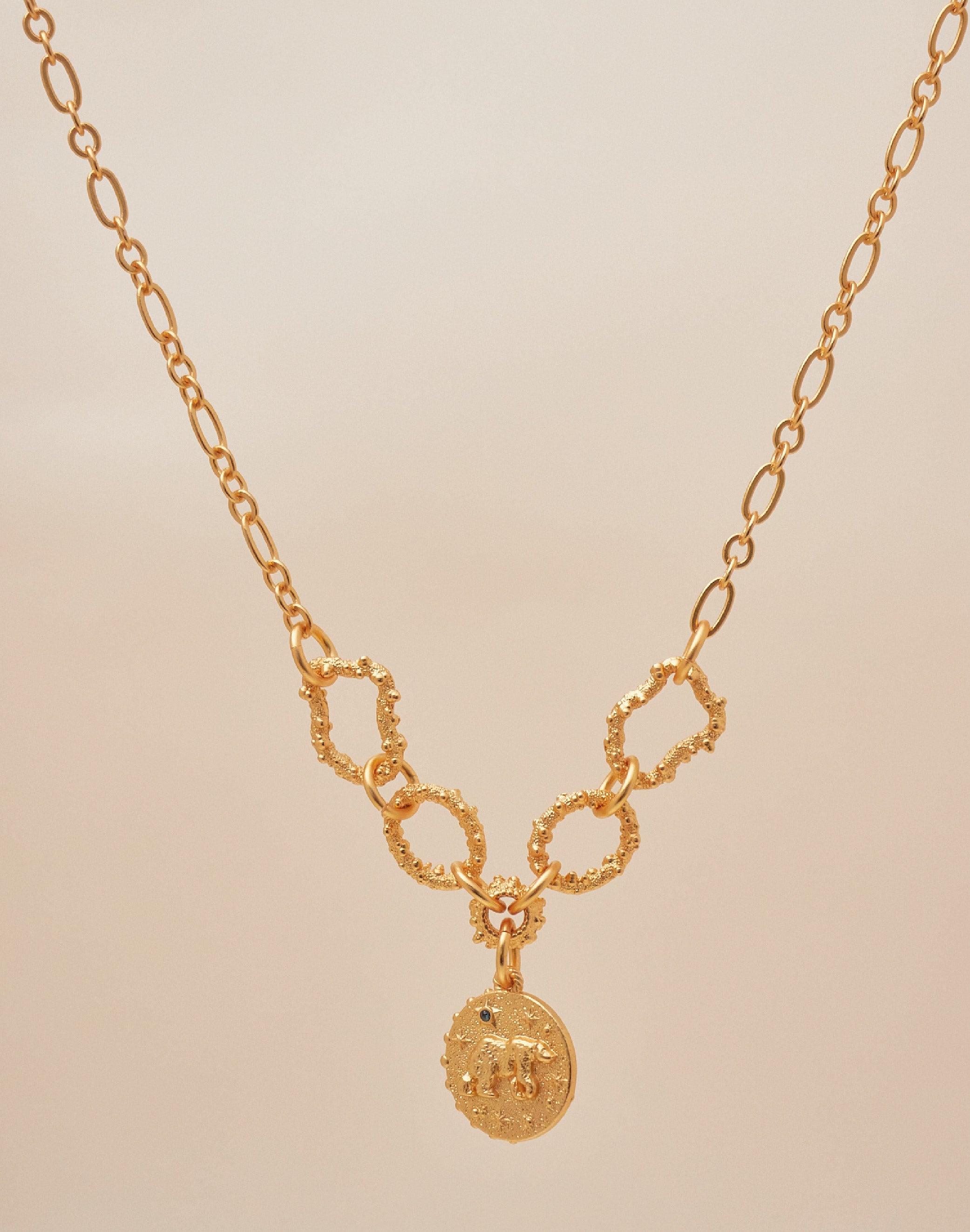 Dos collares que capturan la magia de aurora: uno luce un dije de lobo, mientras el otro brilla con eslabones maxi coronados por una medalla de oso polar. Úsalos juntos...