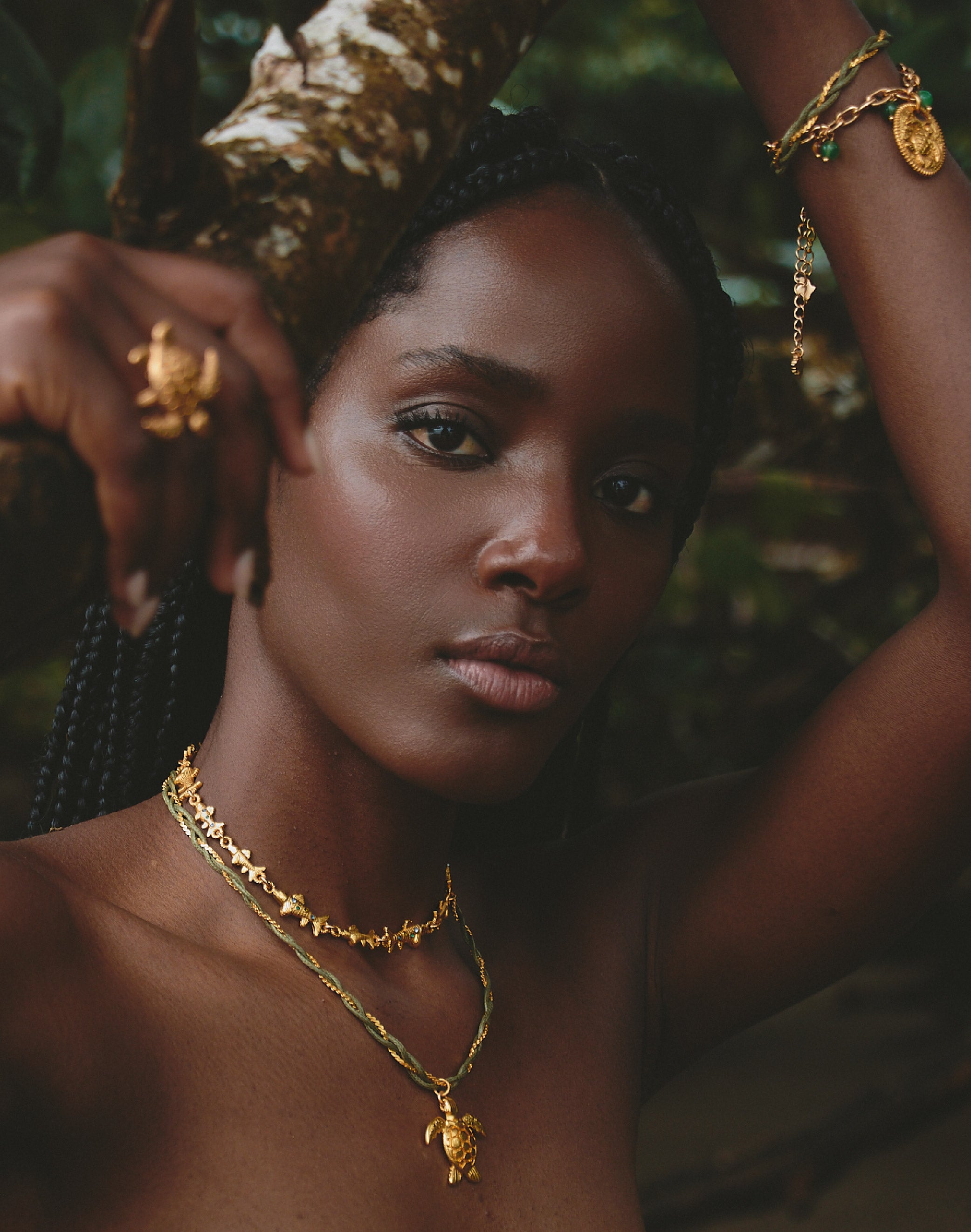Un set inspirado en el movimiento constante del mar Pacífico y sus mareas. Este layering combina un choker de peces en oro italiano con incrustación de cristales cónicos en tonos...