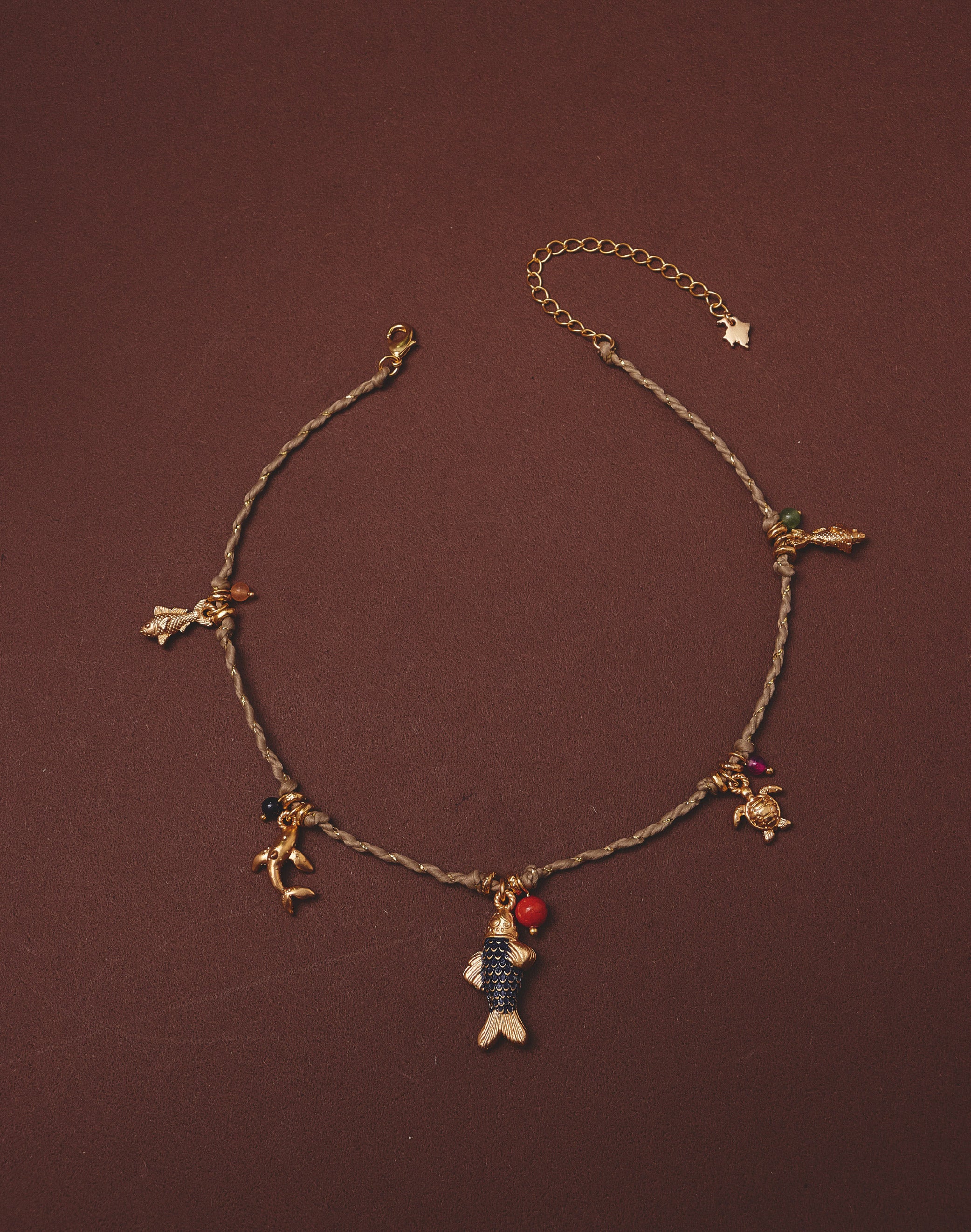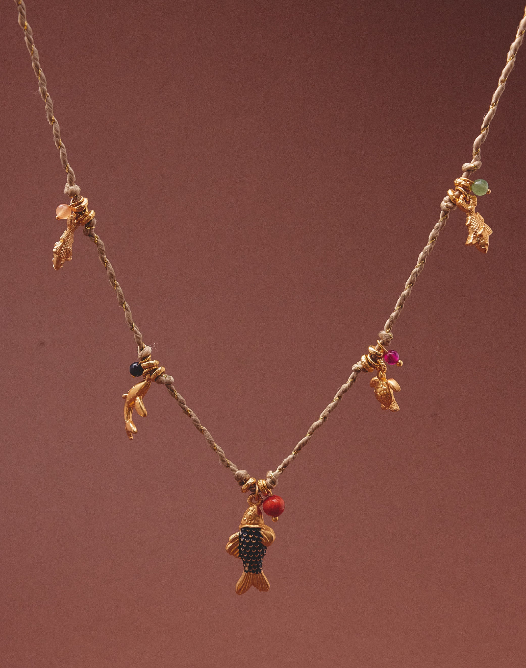 Un set que captura los colores cálidos del atardecer tropical del Pacífico. Este layering combina un collar corto con cordón lurex y múltiples dijes inspirados en la fauna marina, junto...