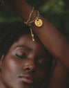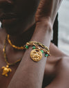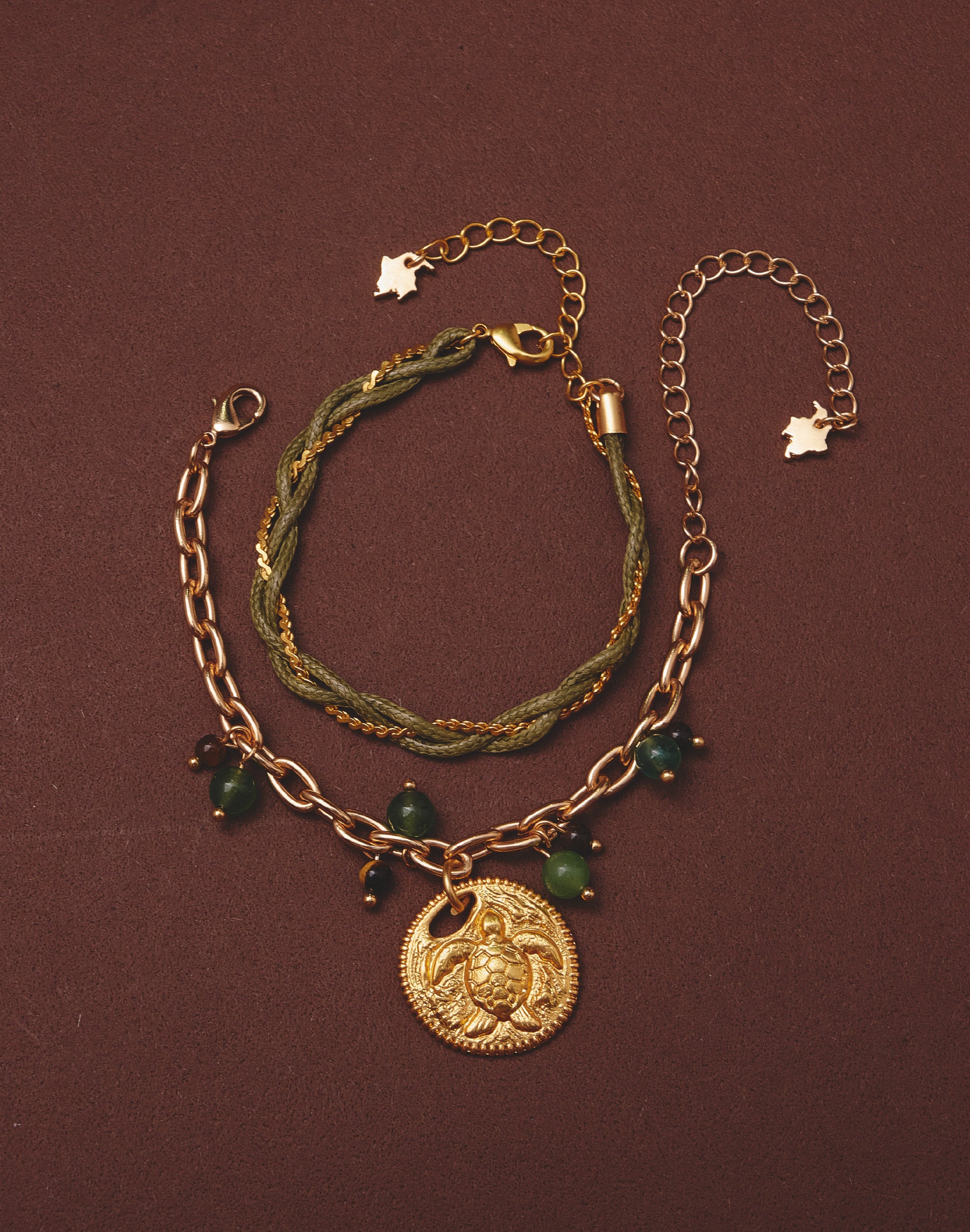 Set de dos pulseras inspirado en los elementos del Pacífico colombiano. Combina una pulsera tejida en hilo encerado y una pulsera con medalla de tortuga, integradas con cadena y baño en Oro 24k. El uso de piedras naturales aporta textura y contraste, logrando un diseño versátil y fácil de combinar.