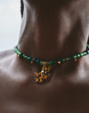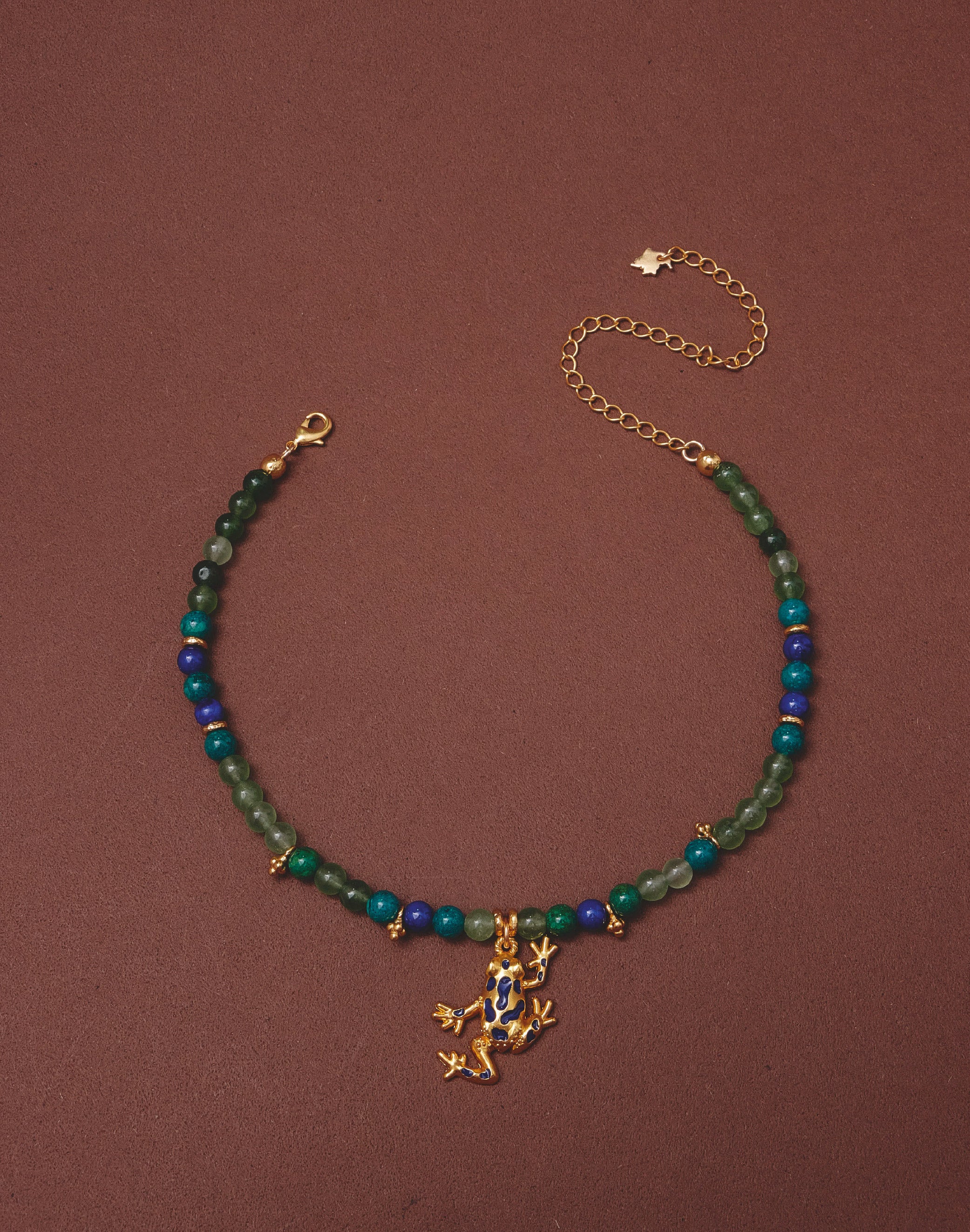Set compuesto por collar corto y aretes tipo topo, ambos con diseño de rana venenosa. El collar incorpora piedras fósiles en tonos verdes y azules y un dije con decoración en resina azul, logrando un contraste de color sutil y llamativo.